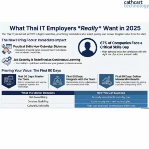 สำหรับแคนดิเดต IT ที่กำลังคิดจะย้ายงานในช่วงปลายปี หรือต้นปีหน้า การเข้าใจ “สิ่งที่ตลาดต้องการจริง” จะช่วยให้คุณวางแผนได้แม่นยำขึ้น และนี่คือสิ่งที่ Cathcart Technology เห็นจากสัญญาณตลาดจริงและข้อมูลจาก The Thaiger: